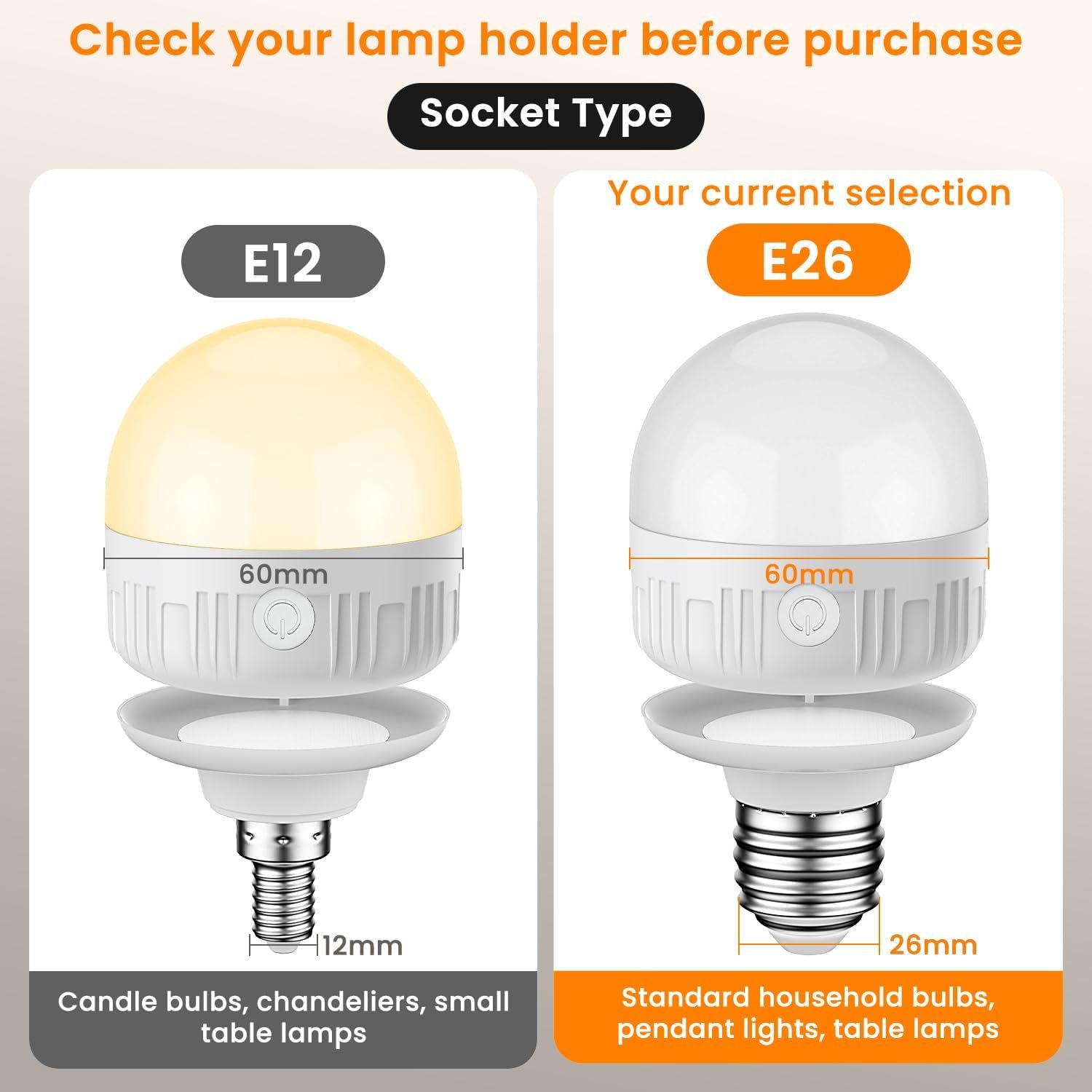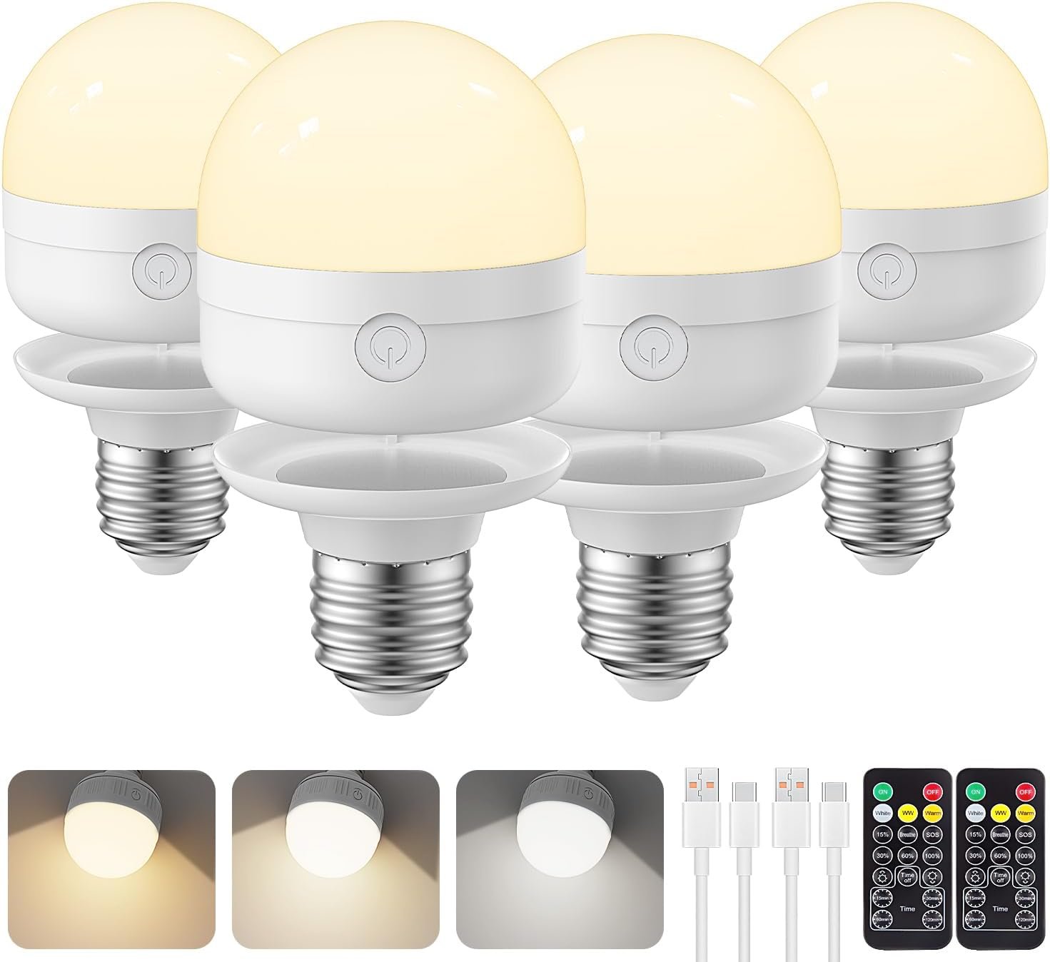 - Rechargeable & Portable: This rechargeable E26 LED bulb combines the convenience of a battery-operated bulb with the versatility of a remote-controlled light. Compact and portable, it delivers smooth, pleasant 350 lm lighting with a 60 mm diameter and 280° diffuser, perfect for any room or scenario. Please confirm your fixture size and socket type before purchase