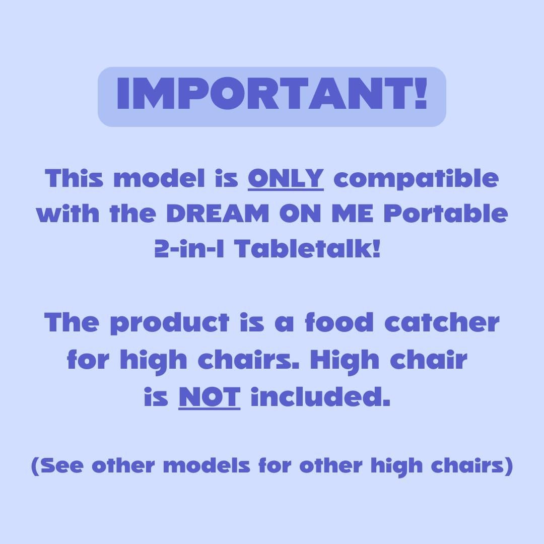 - IMPORTANT: This model is ONLY compatible with the Dream On Me Portable 2-in-1 Tabletalk high chair (HIGH CHAIR SOLD SEPARATELY). See other models for other high chairs