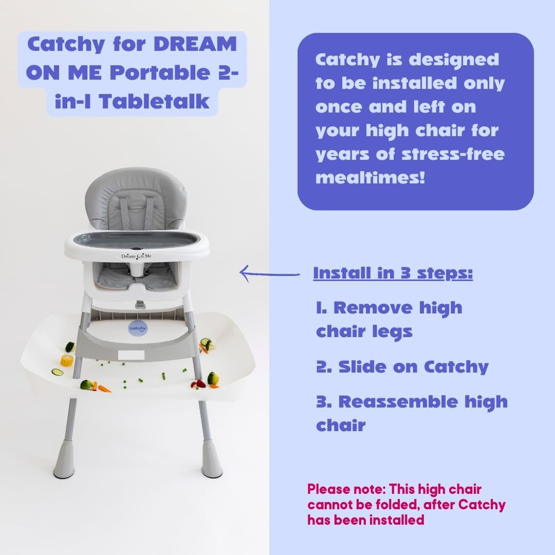 - DESIGNED TO BE INSTALLED ONLY ONCE. Unlike splat mats, our one time installation is left on your high chair for years of stress-free mealtimes! Please note that once the Catchy has been installed, the high chair can no longer fold.