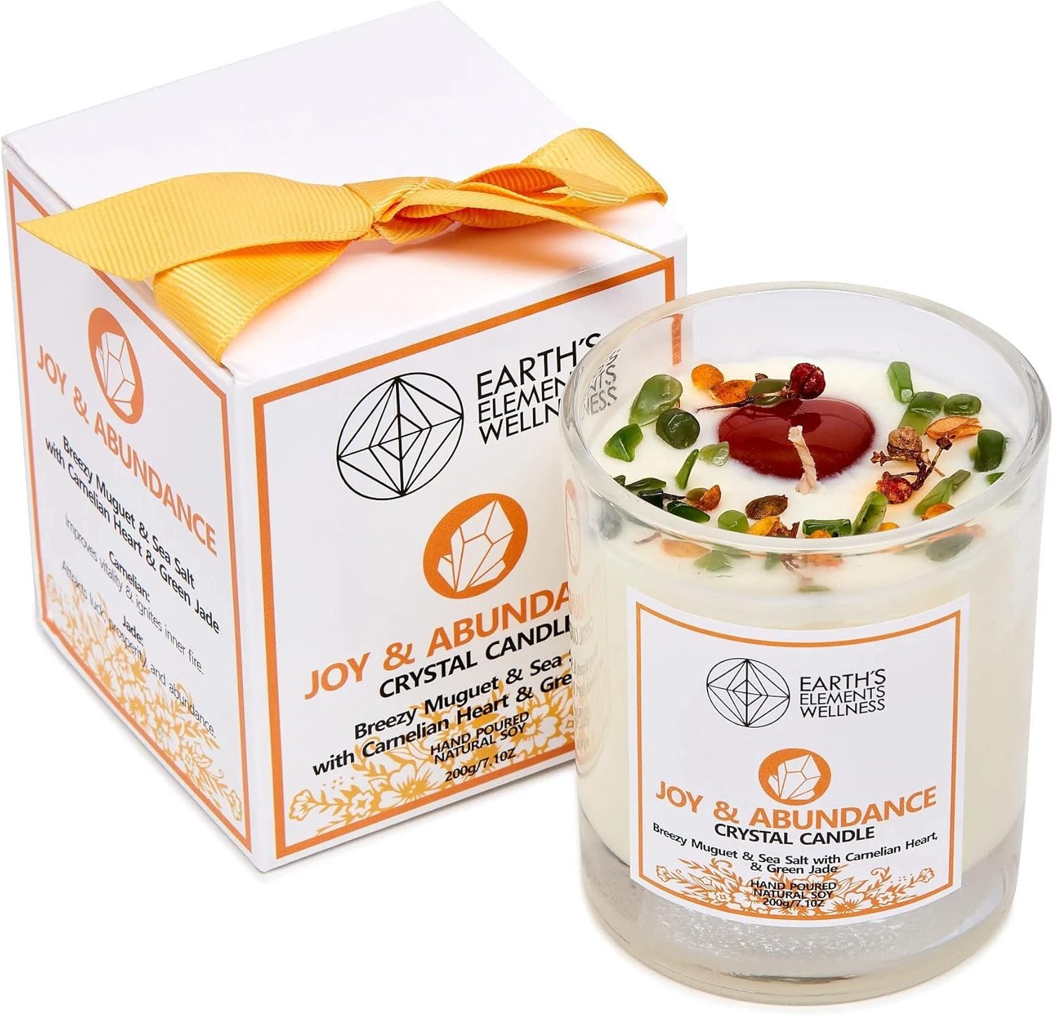 The Earth’s Elements Wellness Joy and Abundance Candle is crafted to create a calming and intentional atmosphere for meditation and reflection. Made from soy wax with a cotton wick, it delivers a clean, even burn and a refreshing Breezy Muguet and Sea Salt scent.
