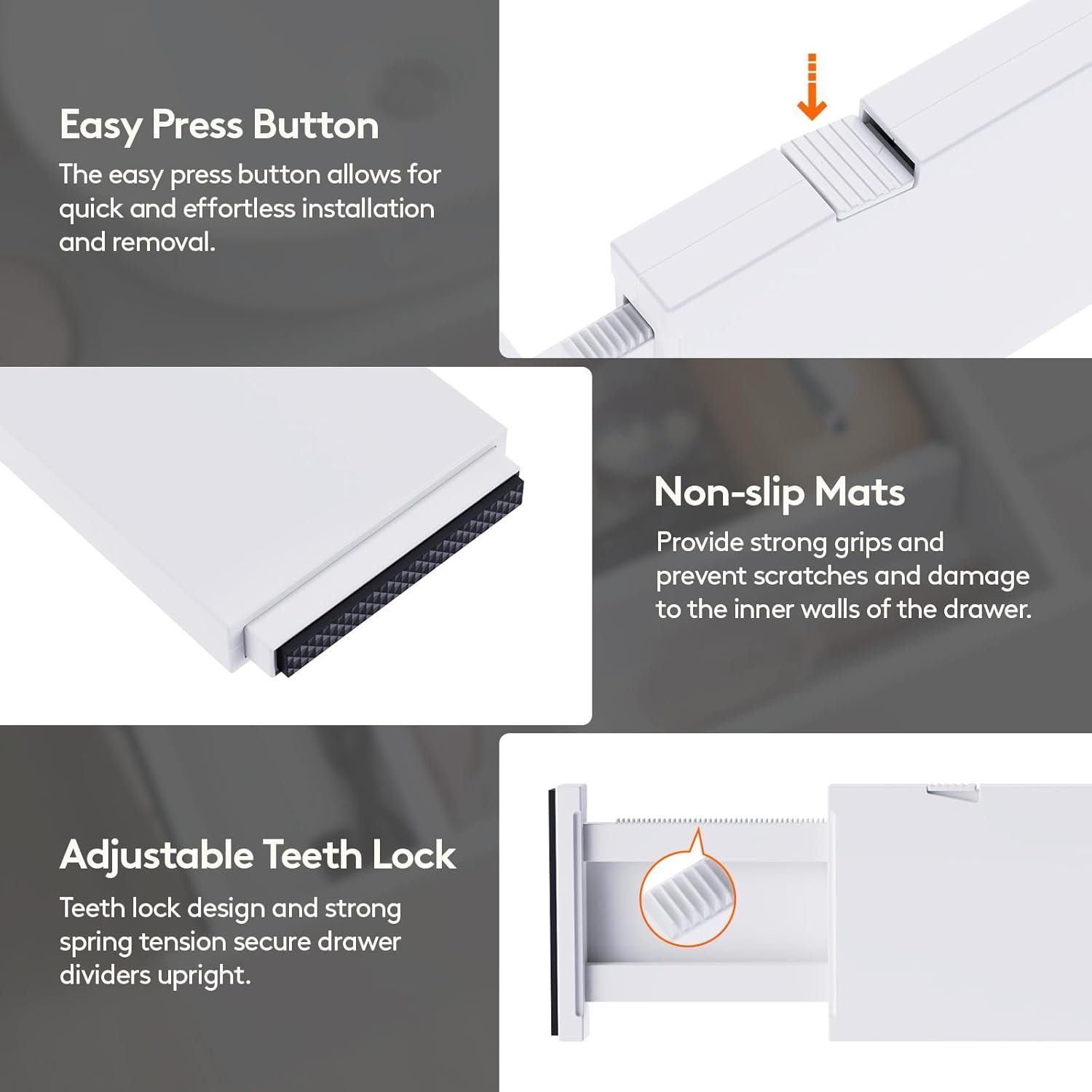 - Easy Installation & Removal: Press the top button to adjust the length before placing, and stretch it out again to secure it tightly before locking it. The strong spring tension keeps each drawer organizer securely upright. To retract, press the top button and push the stretched side.
