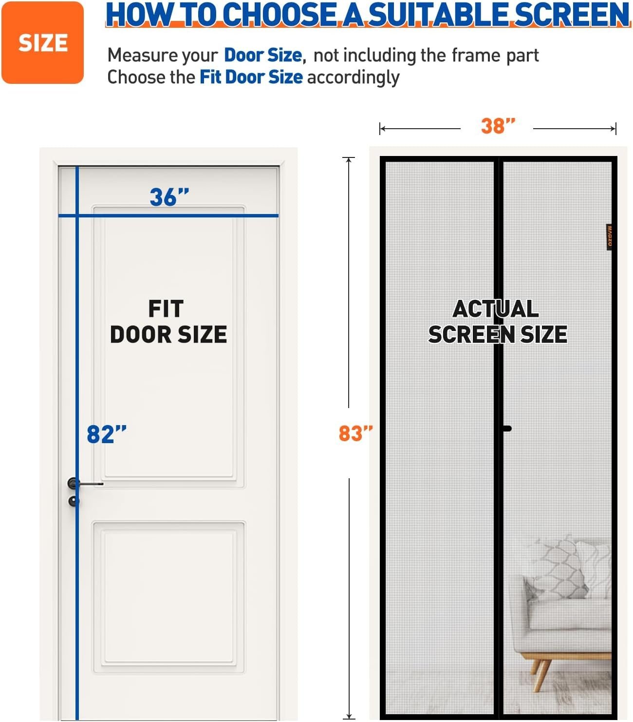 - SCREEN DOOR SIZE – Actual Screen size: 38 x 83 inch, Fit door size: 36 x 82 inch. Please measure your door size (excluding the door frame) before ordering.