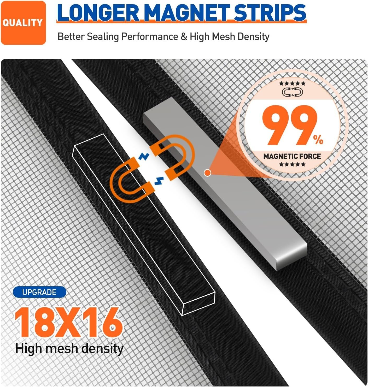 - UPGRADED REINFORCED MAGNET – Screen door mesh is equipped with 99% stronger magnets sewn into the seams, offering easy hands-free opening and quiet, automatic closing.