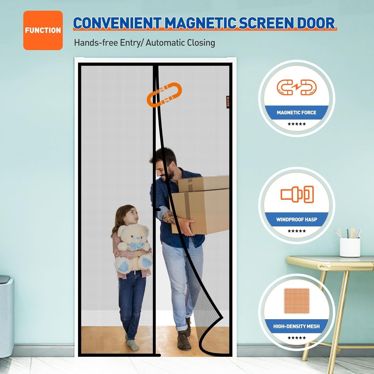 - EXCLUSIVE WINDPROOF FASTENER – Door screen magnetic closure, with its specially designed hasp in the middle, helps ensure it is not easily blown open on windy days.