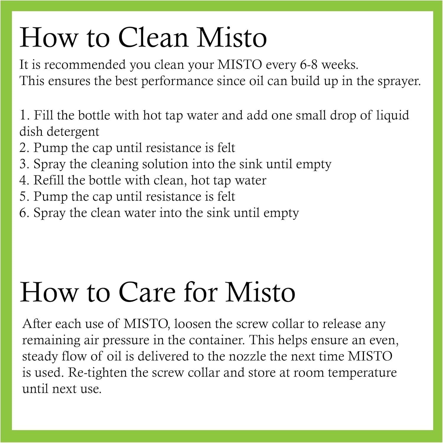 - Misto is a reusable oil spray and mister bottle that gives you the convenience and health benefits of typical aerosol sprayers but in a more healthy, economical and environmental way