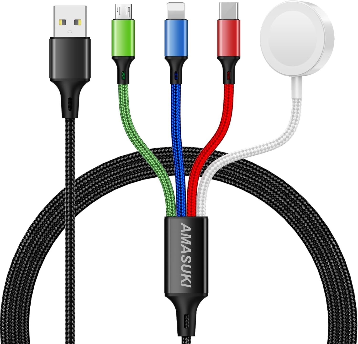 Charge all your devices conveniently with the Upgraded 4-in-1 Multi Charging Cable. Designed with a magnetic Apple Watch iWatch charger and versatile USB-C, Lightning, and Micro connectors, this cable is compatible with iWatch Series 1–10, iPhone 15 & 16, Galaxy, and most Android devices. The durable nylon braided design ensures tangle-free use and long-lasting performance, while the 4-foot length provides flexibility for charging at home, in the office, or on the go. Perfect for users with multiple devices, this all-in-one cable keeps your tech organized and fully powered.