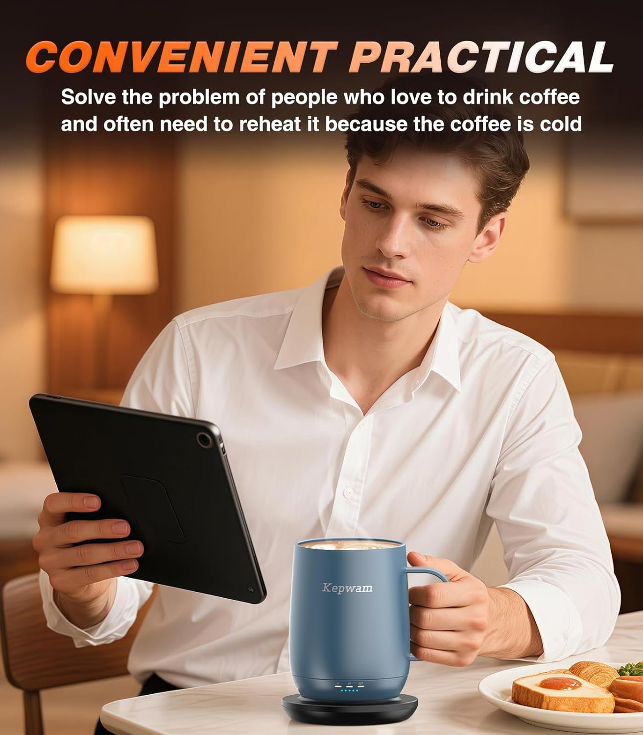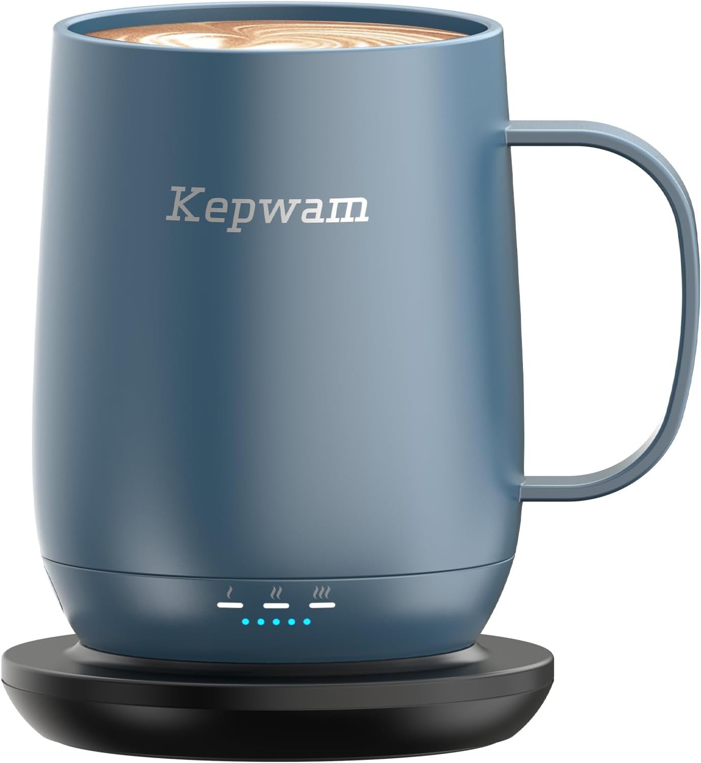 The Kepwam self heating coffee mug keeps your favorite beverages at the perfect temperature wherever your day takes you. Featuring three temperature settings warm hot and piping hot, this smart mug maintains heat for hours on a single charge or continuously when placed on the included charging coaster. The one button design makes operation simple, while the built in display shows temperature and battery status at a glance with no app required. Crafted with a stainless steel interior and a ceramic matte exterior, the double wall insulated design offers comfort, durability, and food grade safety. With a 16 ounce capacity and spill resistant sliding lid, this heated mug makes a thoughtful gift for coffee and tea lovers who enjoy warmth that lasts.
