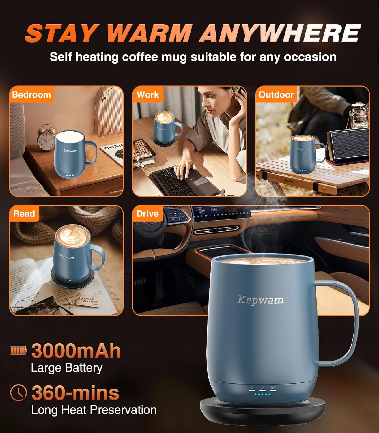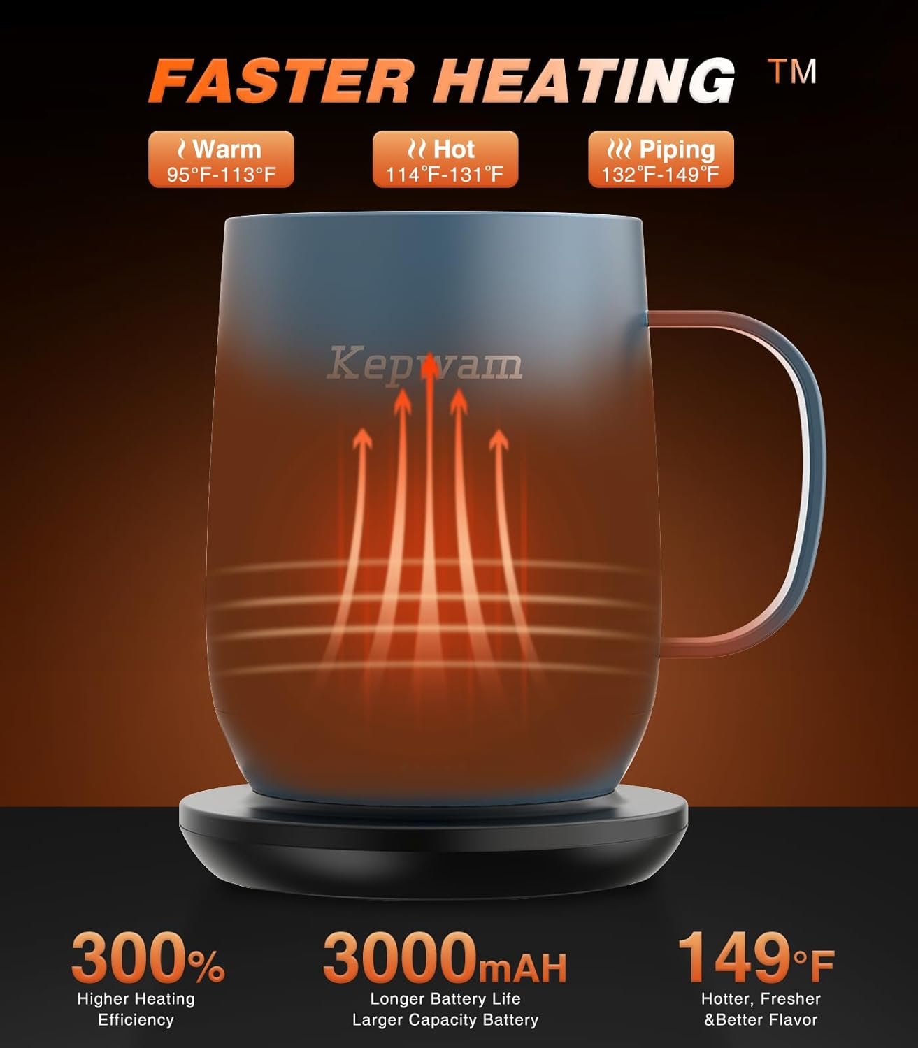 • Temperature Control Mug: Chooses from three settings: warm (113°F), hot (131°F), or piping (149°F). Wherever you are, Kepwam keeps your hot coffee, tea, or preferred beverage at the perfect temperature for hours or all day. The included sliding lid keeps your drinks hotter longer while preventing spills