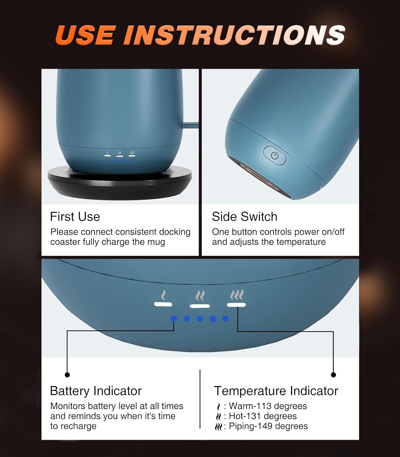 • Smart Mug Technology: Long-lasting battery maintains ideal temperature. Maintains a temperature of 113°F for up to three hours after a full charge (up to 6 full hours with lid on!). Efficient and convenient, it can be used anywhere, or it can be kept warm indefinitely on the included charging coaster