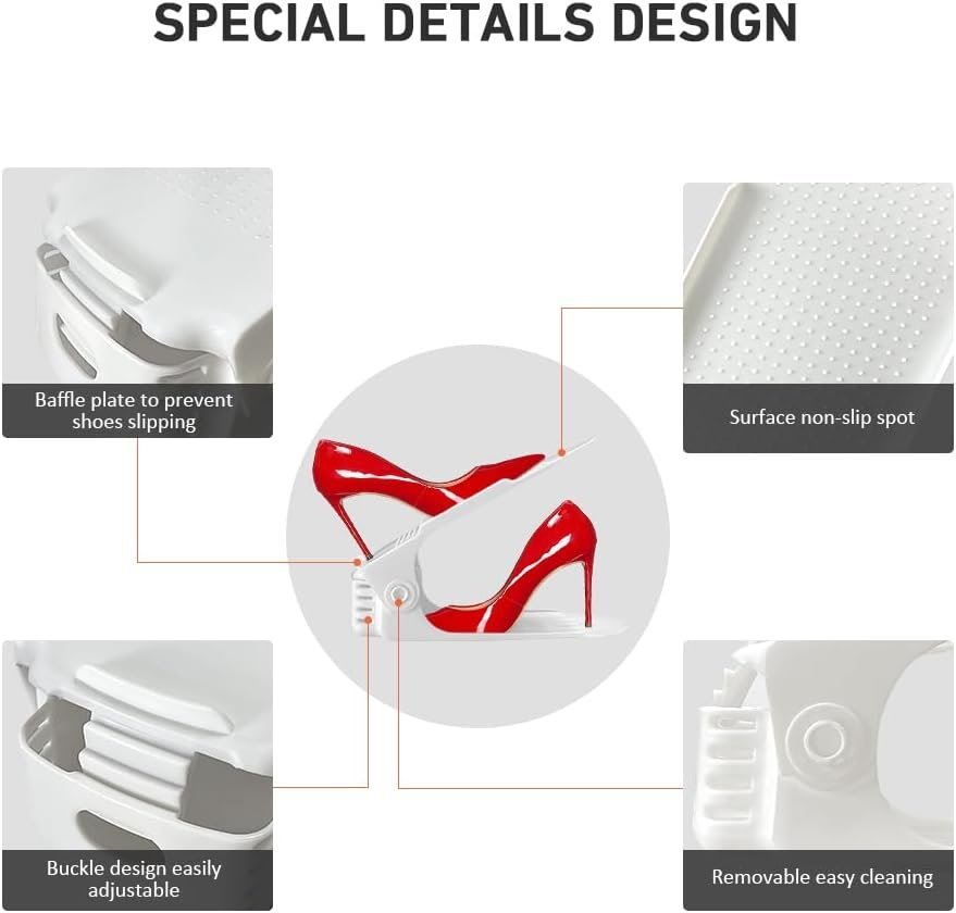 - 50% SHOE SPACE SAVERS : The double-layered design of the shoe slots organizer fits two pairs of shoes in the space for one pair,Greatly increased the storage space of shoe rack, each shoe is allocated its own independent space, ensuring not squeeze and destroy shoes