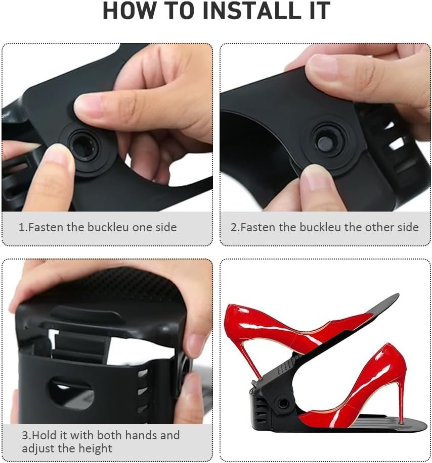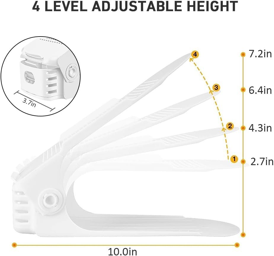 - PERFECT FOR ALL TYPES OF SHOES : 4 Levels adjustable,You can adjust the height flexibly of the shoe slots organizer from 2.7’’ to 7.2’’, the shoe stacker perfect for most shoes, It fits slippers, pumps,sneakers,leather shoes,ankle boots,hiking boots,heels, and children’s shoes