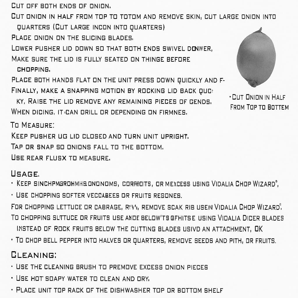 Vidalia Chop Wizard Vegetable and Fruit Chopper is a versatile kitchen tool designed to make food prep fast, safe, and efficient. Featuring interchangeable chopping and dicing blades, it allows you to quickly prepare fruits and vegetables for salads, stir fries, and salsas. The hands free design keeps fingers safely away from the blades while the included 2 cup base container collects ingredients neatly. Sharp stainless steel blades ensure precise cutting and reduced prep time, while dishwasher safe components make cleanup simple. Compact and easy to store, this complete chopping system is ideal for everyday kitchen use.