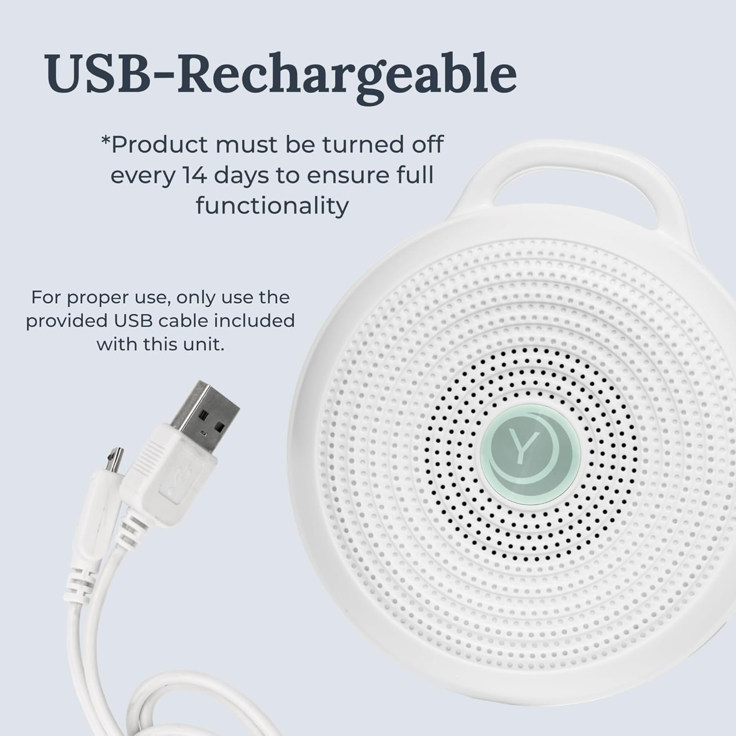 - USB RECHARGEABLE: Operates all night long on a single charge. Includes a USB cord to easily recharge. Intended for portable use & must be turned off and unplugged every 14 days. For proper use, only use the USB cable included with this unit.